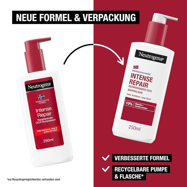 Der Neutrogena Norwegische Formel Intense Repair Reparierender CICA Bodybalsam mit Glycerin & Centella Asiatica für sehr trockene, raue Haut wirkt wissenschaftlich bewiesen wie eine wohltuende feuchtigkeitsspendende 4-in-1-Schutzhülle für die Haut und bietet sofortige Linderung, Reparatur, Stärkung & Schutz vor wiederkehrender Trockenheit. Jetzt NEU mit Centella Asiatica, einer kraftvollen antioxidativen Pflanze, die seit Jahrhunderten für ihre vielfältigen reparierenden Eigenschaften verwendet wird. 87% der Tester:innen hatten das Gefühl, dass ihre sehr trockene Haut nach der Anwendung intensiv repariert wurde*. Der reparierende Bodybalsam zieht schnell ein, sodass Sie sich gleich nach dem Eincremen anziehen können, und spendet 72h lang intensive Feuchtigkeit. Die Hautpflege im praktischen Pumpspender ist dank der hochverträglichen Formel auch für empfindliche Haut geeignet. (*Selbsteinschätzung, 55 Tester:innen)